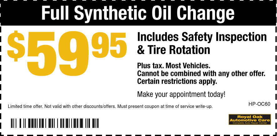 Full Synthetic Oil Change $59.95 Includes Safety Inspection & Tire Rotate